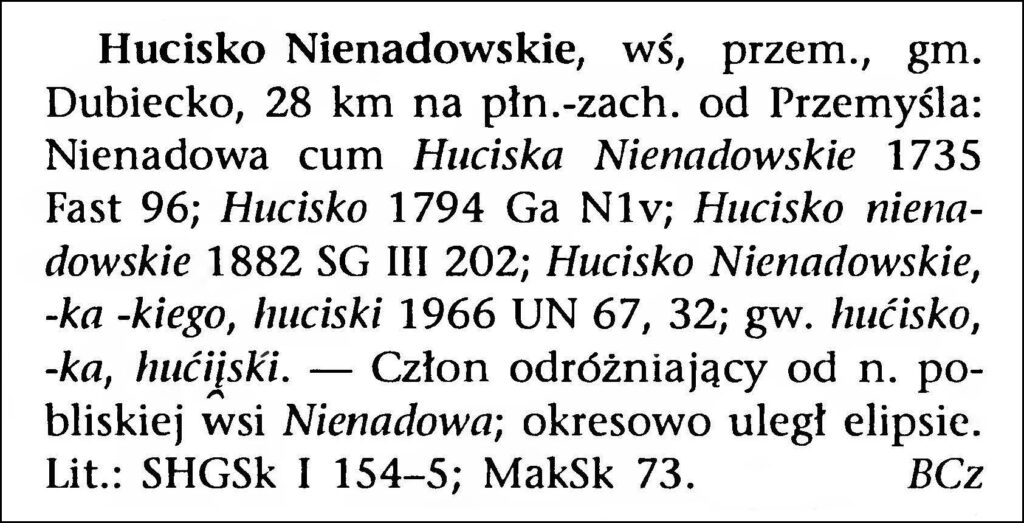Click the link for a PDF copy of the Nazwy Miejscowe Polski entry for Hucisko Nienadowskie. Translated from the Polish, the entry reads: