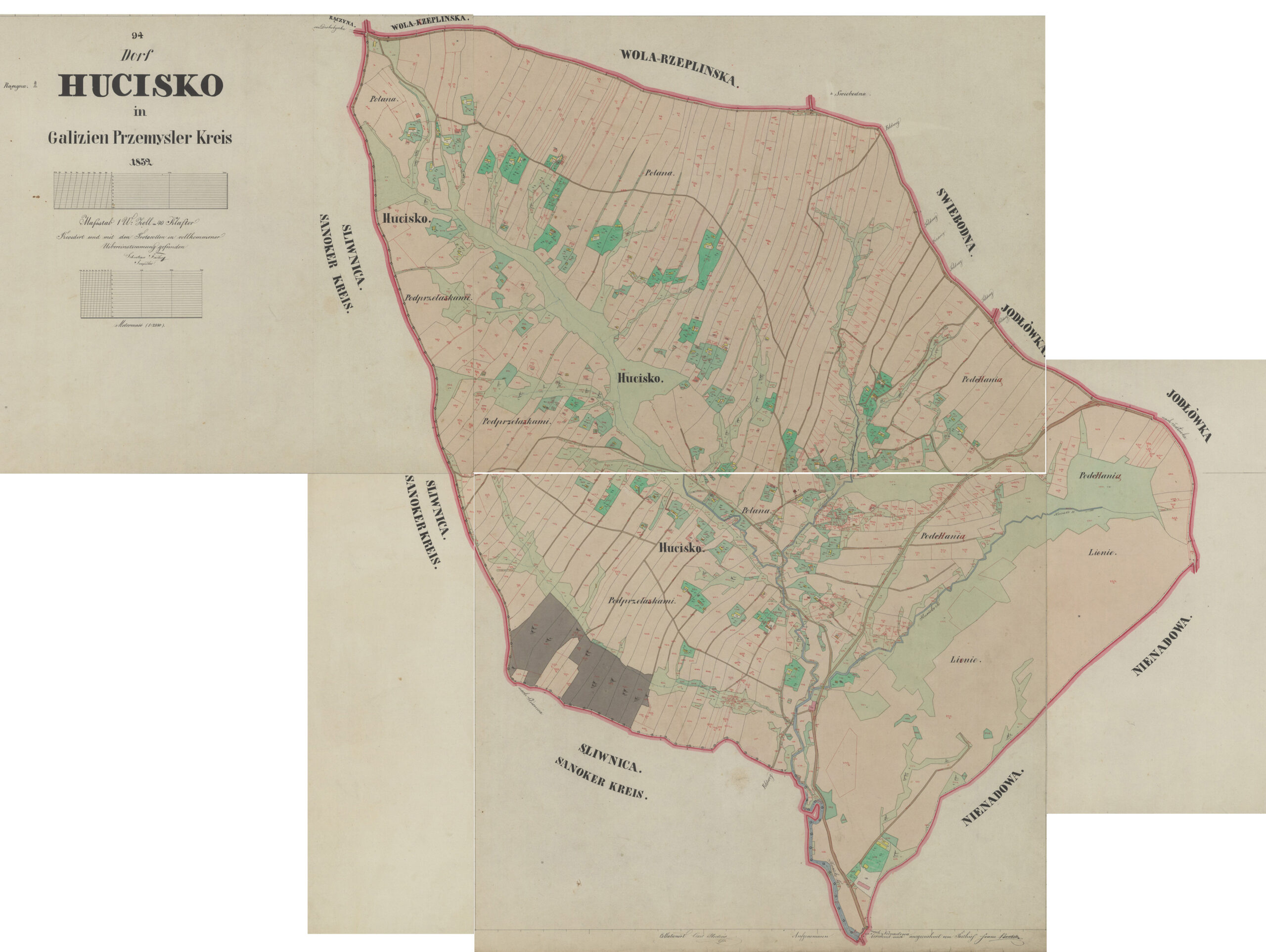 The cadastral map of the Polish village of Hucisko Nienadowskie, created by officials of the Austrian Empire in 1852 is available on the website of the Polish State Archives at Szukaj w Archiwach. The files at Szukaj w Archiwach include five images that, together, form the complete map.