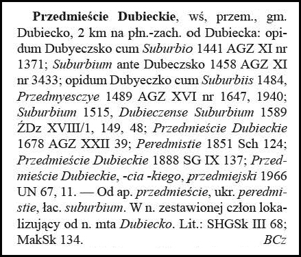 Przedmieście Dubieckie, village, Przemyśl, Dubiecko gmina, 2 kilometers northwest of Dubiecko: opidum Dubyeczsko cum Suburbio 1441 AGZ XI no. 1371; Suburbium ante Dubeczsko 1458 AGZ XI no. 3433; opidum Dubyeczko cum Suburbiis 1484, Przedmyesczye 1489 AGZ XVI no. 1647, 1940; Suburbium 1515, Dubteczense Suburbium 1589 ŻDz XVIII/1, 149, 48; Przedmieście Dubieckie 1678 AGZ XXII 39; Peredmistie 1851 Sch 124; Przedmieście Dubieckie 1888 SG IX 137; Przedmieście Dubieckie, -cia -kiego, Przedmieście Dubieckie 1966 UN 67, 11. – From the appellative [common word] przedmieście, Ukrainian: peredmistie, Latin: suburbium. In the juxtaposed name, a locating element from the name of the city of Dubiecko. Lit.: SHGSk III 68; MakSk 134. BCz
