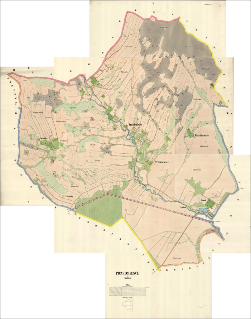 The cadastral map of the Polish village of Przedmieście Dubieckie, created by officials of the Austrian Empire in 1854 is available on the website of the Polish State Archives at Szukaj w Archiwach. The files at Szukaj w Archiwach include seven images in five files that, together, form the complete map.