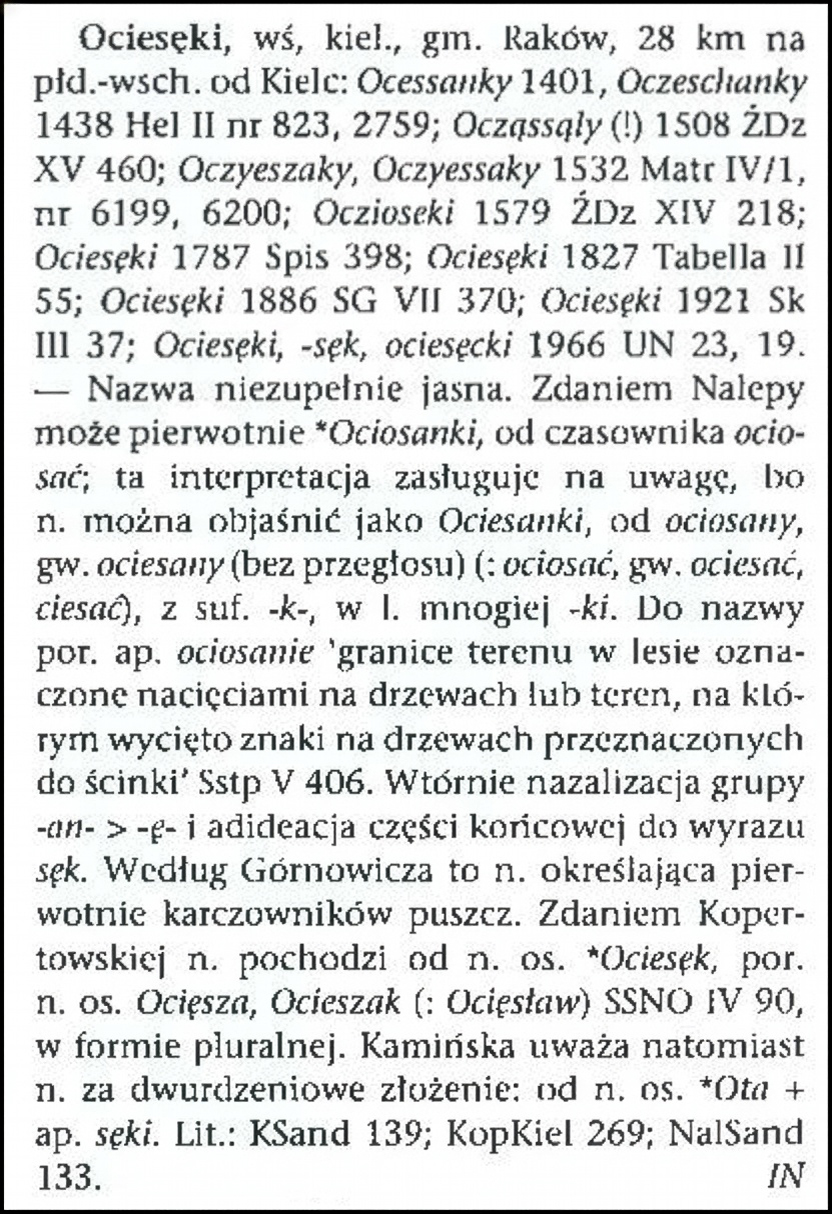 Ociesęki, a village in the Kielce powiat, Raków gmina, 28 km southeast of Kielce: Ocessanky 1401, Oczeschanky 1438 Hel II no. 823, 2759; Ocząssąly (!) 1508 ŹDz XV 460; Oczyeszaky, Oczyessaky 1532 Matr IV/1, no. 6199, 6200; Oczioseki 1579 ŹDz XIV 218; Ociesęki 1787 Spis 398; Ociesęki 1827 Tabella II 55; Ociesęki 1886 SG VII 370; Ociesęki 1921 Sk III 37; Ociesęki, –sęk, ociesęcki 1966 UN 23, 19. — The name is not entirely clear. According to Nalepa, it may originally have been *Ociosanki, from the verb ociosać (to hew); this interpretation deserves attention, as the name can be explained as Ociesanki, from ociosany (hewn), dialectal ociesany (without change of vowel) (: ociosać, dialectal ociesać, ciesać), with the suffix –k-, in the plural –ki. Compare the term ociosanie, meaning boundaries of an area in the forest marked with notches on trees, or an area where marks have been cut on trees intended for felling (Sstp V 406). Secondary nasalization of the group -an- > –ę– and association of the ending with the word sęk [knot]. According to Górnowicz, this name originally referred to forest clearers. According to Kopertowska, the name comes from the personal name *Ociesęk, compare personal names Ocięsza, Ocieszak (: Ocięsław) SSNO IV 90, in the plural form. Kamińska, however, considers the name to be a two-part compound: from the personal name *Ota + the appellative sęki [knots]. Lit.: KSand 139; KopKiel 269; NalSand 133. Iwana Nobis