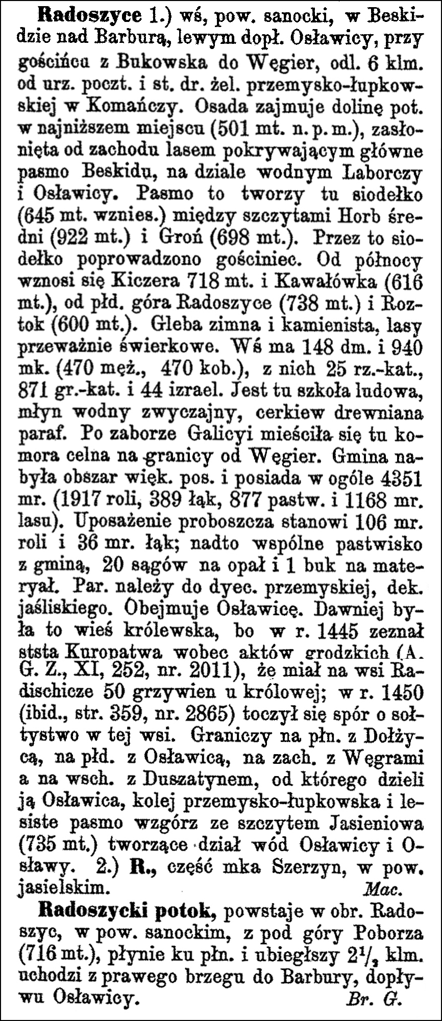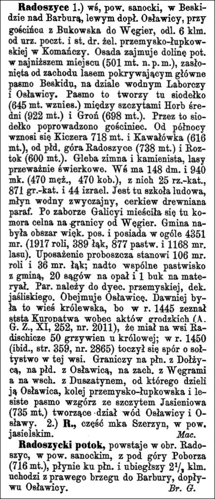 Radoszyce 1.) a village in Sanok County, in the Beskid Mountains on the Barbura stream, a left tributary of the Osławica, on the road from Bukowsko to Hungary, 6 km from the post office and railway station of the Przemyśl-Łupków line in Komańcza. The settlement occupies the valley of the stream at its lowest point (501 meters above sea level), sheltered from the west by a forest covering the main Beskid range, on the watershed between the Laborcza and Osławica rivers. This range forms a saddle here (645 meters elevation) between the peaks of Horb Średni (922 meters) and Groń (698 meters). The main road runs through this saddle. To the north rises Kiczera (718 meters) and Kawałówka (616 meters), to the south Mount Radoszyce (738 meters) and Roztok (600 meters). The soil is cold and stony, the forests are mostly spruce. The village has 148 houses and 940 inhabitants (470 men, 470 women), of whom 25 are Roman Catholic, 871 Greek Catholic, and 44 Jewish. There is a primary school, a watermill, and a wooden parish church. After the annexation of Galicia, a customs office was located here on the border with Hungary. The commune acquired a large estate and owns a total of 4351 mórgs [in Galicia 1 mórg = 1.422 acres] (1917 mórgs of arable land; 389 mórgs of meadows, 877 mórgs of pastures and 1168 mórgs of forest). The parish priest’s endowment consists of 106 mórgs of arable land and 36 mórgs of meadows; in addition, a common pasture with the commune, 20 cords of firewood and 1 beech tree for timber. The parish belongs to the Przemyśl diocese, Jaśliska deanery. It includes Osławica. Formerly, it was a royal village because in 1445 the starost [a kind of district chief or official] Kuropatwa testified before the town court records (A. G. Z., XI, 252, no. 2011) that he owed the queen 50 grzywnas [ancient silver coins, worth several denarii, used in Poland and other countries of Europe] in the village of Radichieze; in 1450 (ibid., p. 359, no. 2865) a dispute over the village headship in this village took place. It borders on the north with Dołżyca, on the south with Osławica, on the west with Hungary, and on the east with Duszatyn, from which it is separated by Osławica, the Przemyśl-Łupków railway line and a wooded range of hills with the Jasieniowa peak (735 meters) forming the watershed between Osławica and Osława. 2.) R., part of the town of Szerzyny, in the Jasło district. M. Maciszewski