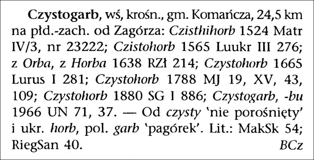Czystogarb, village, Krosno district, Komańcza commune, 24.5 km southwest of Zagórz: Czisthihorb 1524 Matr IV/3, no. 23222; Czistohorb 1565 Luukr III 276; z Orba, z Horba 1638 RZł 214; Czystohorb 1665 Lurus I 281; Czystohorb 1788 MJ 19, XV, 43, 109; Czystohorb 1880 SG I 886; Czystogarb, -bu 1966 UN 71, 37. – From Polish “czysty” ‘not overgrown’ and Ukrainian “horb“, Polish “garb” ‘hillock’. Literature: MakSk 54; RiegSan 40. Barbara Czopek-Kopciuch