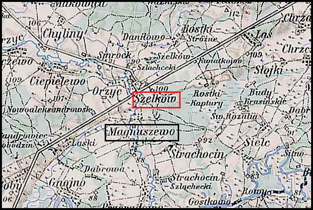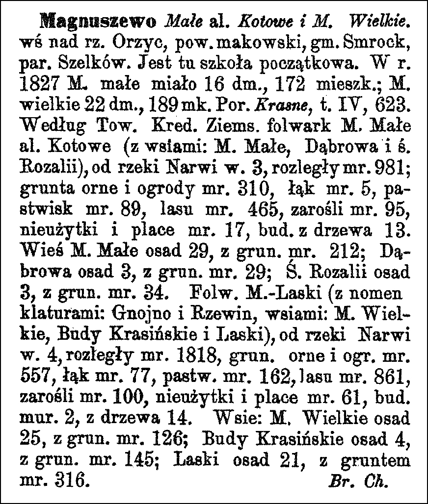 Magnuszewo Małe, also known as Kotowe, and Magnuszewo Wielkie. A village on the Orzyc River, Maków powiat, Smrock gmina, Szelków parish. There is a primary school here. In 1827, Magnuszewo Małe had 16 houses and 172 inhabitants; Magnuszewo Wielkie had 22 houses and 189 inhabitants. See Krasne, vol. IV, p. 623. According to the Land Credit Society, the Magnuszewo Małe (Kotowe) estate (with the villages of Magnuszewo Małe, Dąbrowa, and Święta Rozalia), 3 versts [1 verst = 1.07 kilometers] from the Narew River, covered 981 mórgs [Gerald Ortell’s book on Polish Parish Records states that in the Russian partition 1 mórg = 1.388 acres]; arable land and gardens 310 mórgs, meadows 5 mórgs, pastures 89 mórgs, forest 465 mórgs, thickets 95 mórgs, unproductive land and building plots 17 mórgs, 13 wooden buildings. The village of Magnuszewo Małe had 29 settlements, with 212 mórgs of land; Dąbrowa had 3 settlements, with 29 mórgs of land; Święta Rozalia had 3 settlements, with 34 mórgs of land. The Magnuszewo-Laski estate (with the localities of Gnojno and Rzewin, and the villages of Magnuszewo Wielkie, Budy Krasińskie, and Laski), 4 versts from the Narew River, covered 1818 mórgs, arable land and gardens 557 mórgs, meadows 77 mórgs, pastures 162 mórgs, forest 861 mórgs, thickets 100 mórgs, unproductive land and building plots 61 mórgs, 2 brick buildings, 14 wooden buildings. Villages: Magnuszewo Wielkie 25 settlements, with 126 mórgs of land; Budy Krasińskie 4 settlements, with 145 mórgs of land; Laski 21 settlements, with 316 mórgs of land. Bronisław Chlebowski