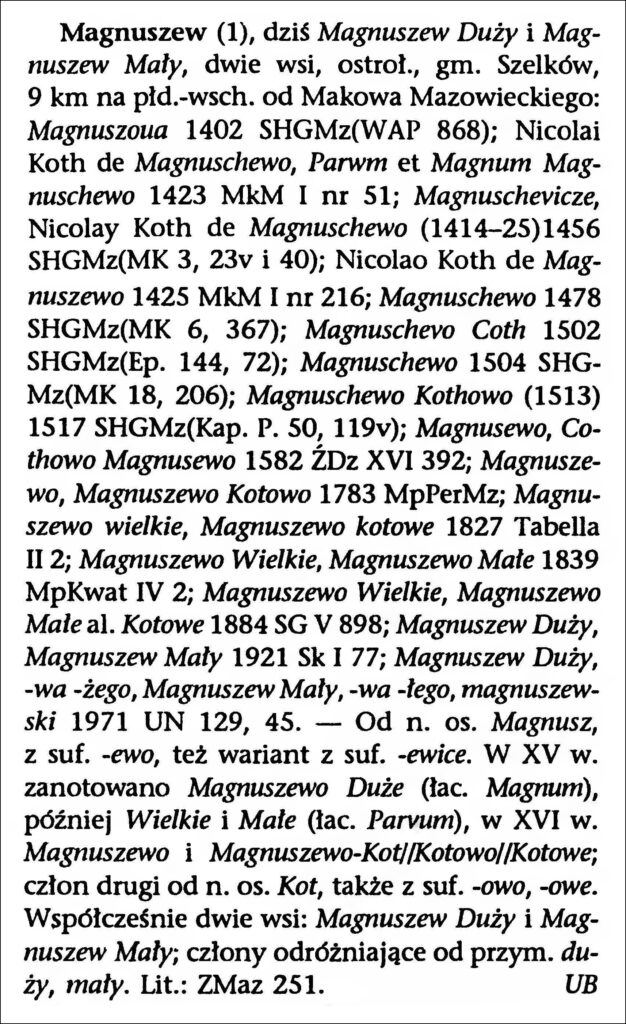 Magnuszew (1), today Magnuszew Duży and Magnuszew Mały, two villages, Ostrołęka voivodeship, Szelków gmina, 9 kilometers southeast of Maków Mazowiecki: Magnuszoua 1402 SHGMz (WAP 868); Nicolai Koth de Magnuschewo, Parwm et Magnum Magnuschewo 1423 MkM I no. 51; Magnuschevicze, Nicolay Koth de Magnuschewo (1414-25) 1456 SHGMz (MK 3, 23v and 40); Nicolao Koth de Magnuszewo 1425 MkM I no. 216; Magnuschewo 1478 SHGMz (MK 6, 367); Magnuschevo Coth 1502 SHGMz (Ep. 144, 72); Magnuschewo 1504 SHGMz (MK 18, 206); Magnuschewo Kothowo (1513) 1517 SHGMz (Kap. P. 50, 119v); Magnusewo, Cothowo Magnusewo 1582 ŹDz XVI 392; Magnuszewo, Magnuszewo Kotowo 1783 MpPerMz; Magnuszewo wielkie, Magnuszewo kotowe 1827 Tabella II 2; Magnuszewo Wielkie, Magnuszewo Małe 1839 MpKwat IV 2; Magnuszewo Wielkie, Magnuszewo Małe al. Kotowe 1884 SG V 898; Magnuszew Duży, Magnuszew Mały 1921 Sk I 77; Magnuszew Duży, -wa -żego, Magnuszew Mały, -wa -łego, magnuszewski 1971 UN 129, 45. – From the name of a settlement Magnusz, with the suffix -ewo, also a variant with the suffix -ewice. In the 15th century, Magnuszewo Duże (Latin: Magnum) was recorded, later followed by Wielkie and Małe (Latin: Parvum), and in the 16th century, Magnuszewo and Magnuszewo-Kot//Kotowo//Kotowe; the second part derived from the surname Kot, also with the suffixes -owo, -owe. Currently, there are two villages: Magnuszew Duży and Magnuszew Mały; the distinguishing parts come from the adjectives duży [large] and mały [small]. Lithuanian: ZMaz 251. Ursula Bijak
