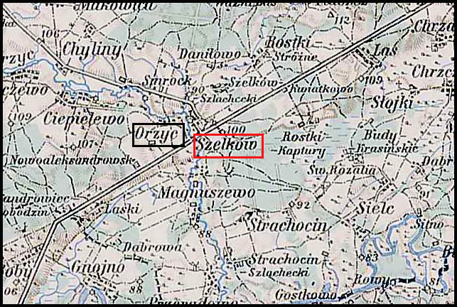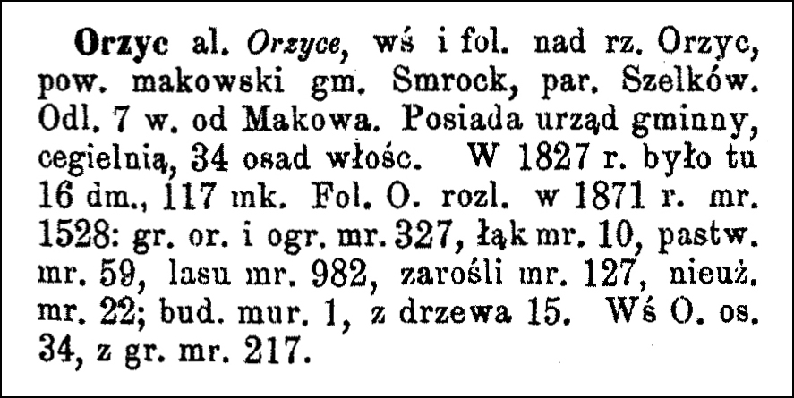 Orzyc also known as Orzyce, a village and manor on the Orzyc River, in Maków powiat, Smrock gmina, Szelków parish. Located 7 versts [1 verst = 1.07 kilometers] from Maków. It has a gmina office, a brickyard, and 34 peasant settlements. In 1827, there were 16 houses and 117 inhabitants. The Orzyc manor, in 1871, covered 1528 mórgs [Gerald Ortell’s book on Polish Parish Records states that in the Russian partition 1 mórg = 1.388 acres]: 327 mórgs of arable land and gardens, 10 mórgs of meadows, 59 mórgs of pastures, 982 mórgs of forest, 127 mórgs of scrubland, and 22 mórgs of unproductive land; 1 brick building and 15 wooden buildings. The village of Orzyc had 34 settlements and 217 mórgs of land.