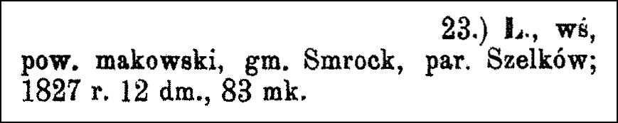 The Słownik Geograficzny Królestwa Polskiego i Innych Krajów Słowiańskich (Geographical Dictionary of the Kingdom of Poland and other Slavonic Countries) includes multiple entries for Polish villages called Laski, but only one belonging to the parish of Szelków.