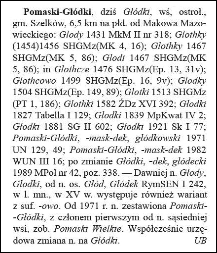 Pomaski-Głódki, today Glódki, a village in the Ostrołęka voivodeship, Szelków gmina, 6.5 km south of Maków Mazowiecki: Głody 1431 MkM II no. 318; Glothky (1454) 1456 SHGMz (MK 4, 16); Glothky 1467 SHGMz (MK 5, 86); Glodi 1467 SHGMz (MK 5, 86); in Glothcze 1476 SHGMz (Ep. 13, 31v); Glothcowo 1499 SHGMz (Ep. 16, 9v); Glodky 1504 SHGMz (Ep. 149, 89); Glotki 1513 SHGMz (PT 1, 186); Glothki 1582 ŹDzXVI 392; Głodki 1827 Tabella I 129; Głodki 1839 MpKwat IV 2; Głodki 1881 SG II 602; Głodki 1921 Sk I 77; Pomaski-Głódki, -mask-dek, glódkowski 1971 UN 129, 49; Pomaski-Glódki, -mask-dek 1982 WUN III 16; after the change Glódki, -dek, glódecki 1989 MPol no. 42, item 338. – Formerly named Głody, Głodki, from the name of a settlement Głód, Glódek RymSEN I 242, in the plural form, in the 15th century a variant with the suffix -owo also appears. Since 1971, the name has been combined as Pomaski-Glódki, with the first part from the name of the neighboring village, see Pomaski Wielkie. Currently, the official name change is to Glódki. Urszula Bijak