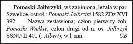 Click the link for a PDF copy of the Nazwy Miejscowe Polski entry for Pomaski-Jałbrzyki. Translated rom the Polish, the entry reads: